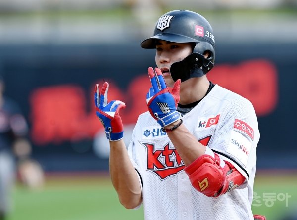 13일 경기도 수원 kt위즈파크에서 ‘2020 신한은행 SOL KBO리그’ kt 위즈와 한화 이글스의 경기가 열렸다. 2회말 2사 1, 2루에서 kt 심우준이 1타점 동점 적시타를 날린 뒤 세리머니를 펼치고 있다.