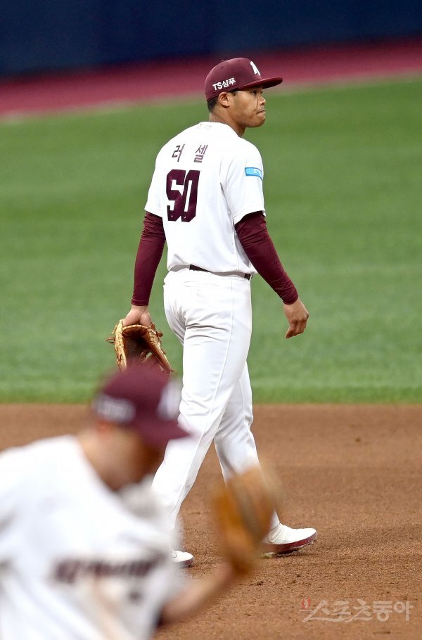 5회초 1사 1,3루 두산 내야 땅볼 때 키움 러셀이 송구 실책을 범한 후 아쉬워하고 있다.