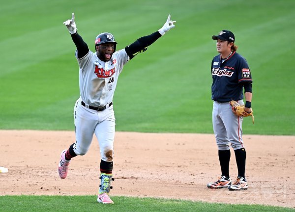 9회말 2사 1루에서 kt 로하스가 끝내기 2루타를 날린 뒤 포효하고 있다.