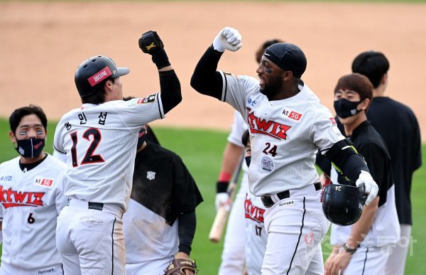 9회말 2사 1루에서 kt 로하스가 끝내기 2루타를 날린 뒤 득점에 성공한 송민섭과 기쁨을 나누고 있다.