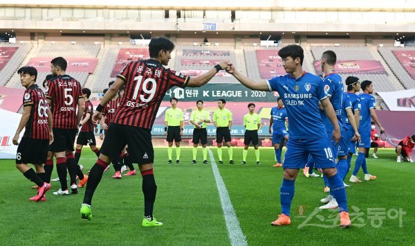 서울 윤주태와 수원 김민우가 경기 시작 전 주먹을 맞대며 인사하고 있다.