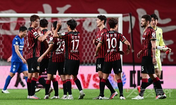 서울이 수원에 2-1로 승리를 거둔 뒤 선수들이 기쁨을 나누고 있다.