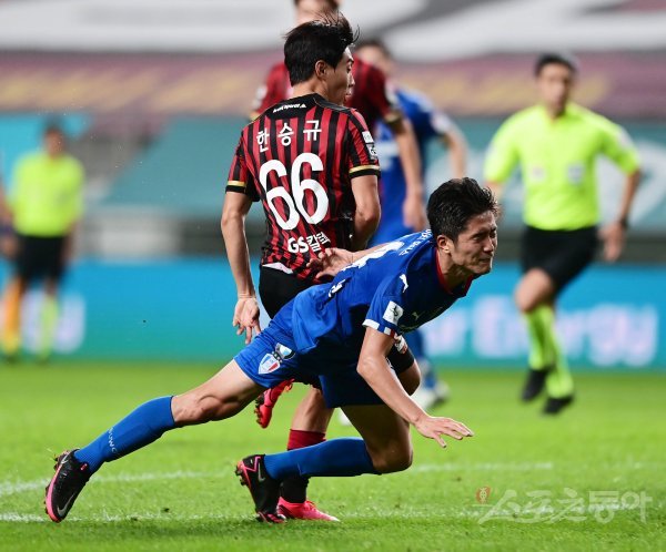 수원 이상민이 후반전에 서울 한승규와 몸싸움에 넘어지고 있다.