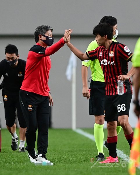 13일 서울 월드컵경기장에서 ‘하나원큐 K리그1 2020’ FC 서울과 수원 삼성의 경기가 열렸다. 서울 김호영 감독 대행이 후반전에 두 번째 골을 넣은 한승규와 하이파이브를 하고 있다. 상암|주현희 기자 teth1147@donga.com