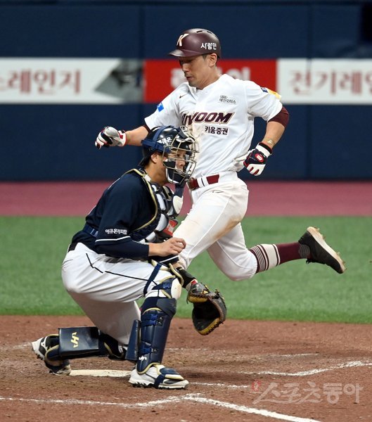 13일 서울 고척스카이돔에서 ‘2020 신한은행 SOL KBO 리그‘ 두산 베어스와 키움 히어로즈 경기가 열렸다. 8회말 1사 2,3루 키움 적시타 때 2루주자 서건창이 동점 득점에 성공하고 있다. 고척|김종원 기자 won@donga.com