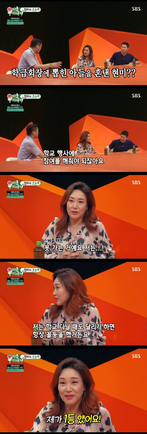 이날 주현미는 첫째 아들이 학급 회장을 하면 혼냈다고 말하며 “임원 엄마가 되면 학교 행사가 있으면 참여를 해야 하는데 내가 스케줄이 안 되니 할 수가 없었다”라며 “그러니 민폐가 될 수 밖에 없다. 그래서 제발 학급 회장을 하지 말라고 했다. 지금 생각해보면 아이에게 큰 상처가 될 수도 있었을 것”이라고 미안한 마음을 드러냈다.