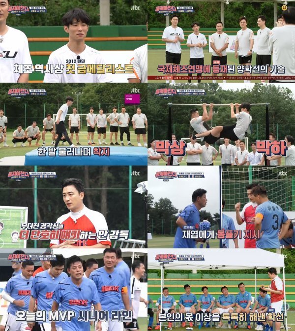 이날은 대한민국 최초 올림픽 체조 금메달리스트 양학선이 용병으로 출격해 도마의 神 여홍철과 함께 흥미진진한 피지컬 테스트를 진행했다. 공중에서 유려하게 몸을 날리는 양학선은 보는 이들의 시선을 사로잡았고, 여홍철은 그가 세운 고유의 기술 ‘여(YEO2)’를 선보여 가슴 벅찼던 올림픽의 감동을 재현시켰다.