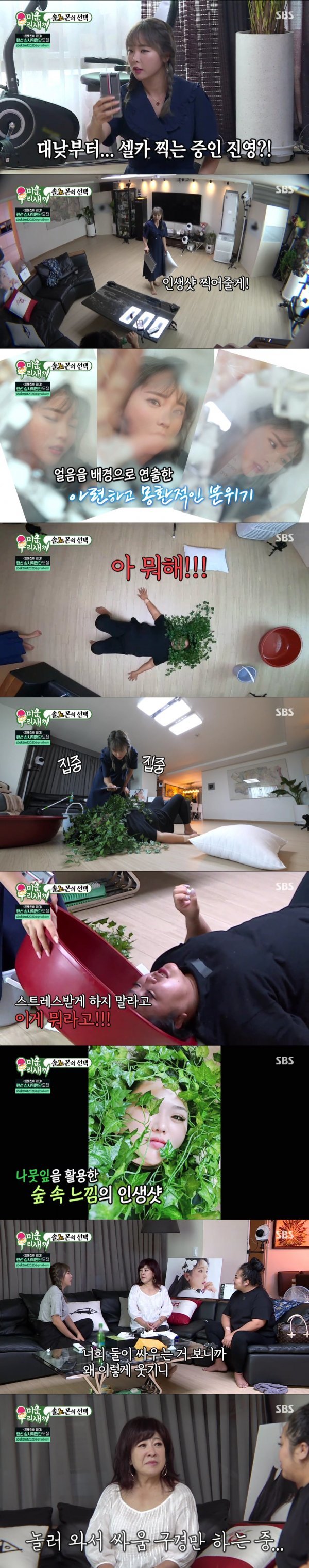 한편, 이날 16.9% 최고의 1분 주인공은 홍선영, 홍진영 자매가 차지했다. 홍진영은 홍선영에게 요즘 SNS에서 유행하는 인생샷을 찍어주겠다고 제안해 관심을 모았다. 먼저, 홍진영은 투명판 얼음 배경의 사진에 도전했는데, 아련하고 몽환적인 느낌의 인생샷에 성공했다. 반면, 홍선영은 홍진영과 달리 ‘그것이 알고 싶다’ 사건 현장 같은 살벌한 분위기를 안겨줘 폭소케 만들었다.