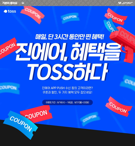 LCC(저비용항공사) 진에어는 모바일 금융 플랫폼인 토스(toss)와 모바일 앱 전용 타임 세일 프로모션을 16일부터 진행한다.진에어는 이번 프로모션에서 토스와 함께 기획한 이벤트 ‘진에어 혜택을 toss하다’ 를 선보일 예정이다. 국내선 전 노선 대상으로 진행하며 진에어 앱에서 발송되는 알림을 통해 이벤트 페이지로 접속하면 된다.