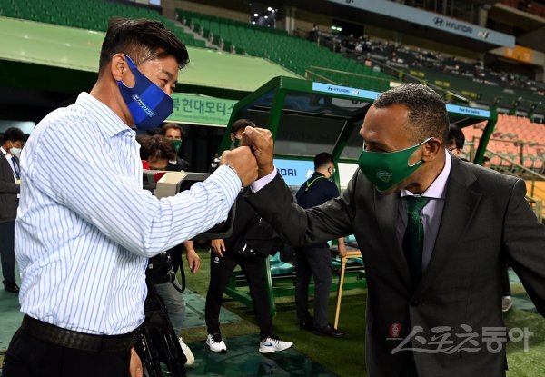 15일 전라북도 전주 월드컵경기장에서 열린 ‘하나원큐 K리그1 2020’ 전북 현대와 울산 현대의 경기에서 울산 김도훈 감독과 전북 모라이스 감독이 주먹으로 인사하고 있다.