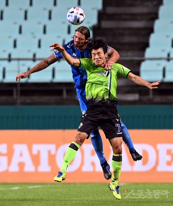15일 전라북도 전주 월드컵경기장에서 열린 ‘하나원큐 K리그1 2020’ 전북 현대와 울산 현대의 경기에서 울산 불투이스와 전북 한교원이 공중볼을 다투고 있다.