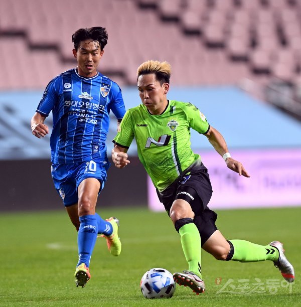 15일 전라북도 전주 월드컵경기장에서 열린 ‘하나원큐 K리그1 2020’ 전북 현대와 울산 현대의 경기에서 전북 쿠니모토가 울산 윤빛가람의 수비를 제치며 돌파하고 있다.
