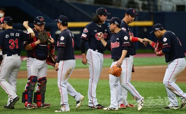 롯데가 키움에 8-5로 승리를 거둔 뒤 선수들이 기쁨을 나누고 있다.