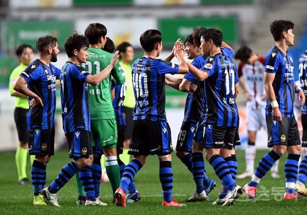 16일 인천 축구전용경기장에서 열린 ‘하나원큐 K리그1 2020’ 인천 유나이티드와 FC 서울의 경기에서 인천이 서울에 1-0으로 승리한 뒤 선수들이 그라운드에서 기쁨을 나누고 있다.