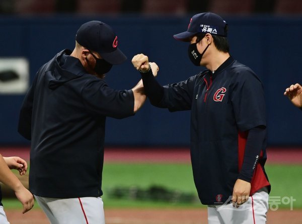 롯데가 키움에 8-2로 승리를 거둔 뒤 허문회 감독이 스트레일리와 기쁨을 나누고 있다.