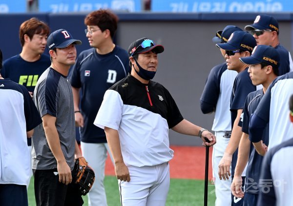 경기 전 kt 김태균 코치가 두산 선수들과 이야기를 나누고 있다.