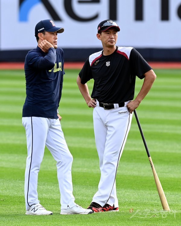 경기 전 두산 조성환 코치와 kt 박기혁 코치가 이야기를 나누고 있다.