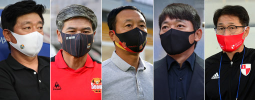 K리그1(1부) 22라운드 6경기가 20일 일제히 벌어진다. 파이널A에 들어갈 6위 경쟁이 점입가경인 가운데 인천 유나이티드가 최근 살아나면서 최하위 싸움도 한층 치열해졌다. 6위 경쟁에서 밀리면 강등권 경쟁으로 내몰릴 수도 있어 해당 팀 사령탑들은 22라운드에 사활을 걸고 있다. 사진은 강원 김병수 감독-서울 김호영 감독대행-광주 박진섭 감독-성남 김남일 감독- 부산 조덕제 감독(왼쪽부터). 사진제공|한국프로축구연맹·스포츠동아DB