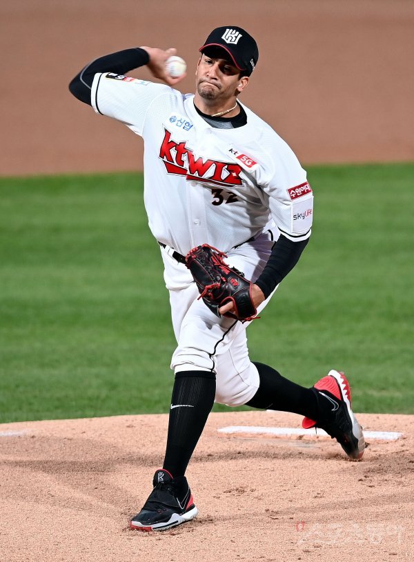 kt 선발투수 쿠에바스가 힘차게 볼을 던지고 있다.
