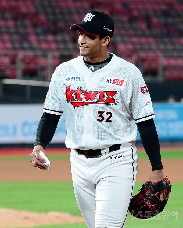 5회까지 두산 공격을 무실점으로 막은 kt 선발 쿠에바스가 이닝 종료 후 더그아웃으로 들어서고 있다.