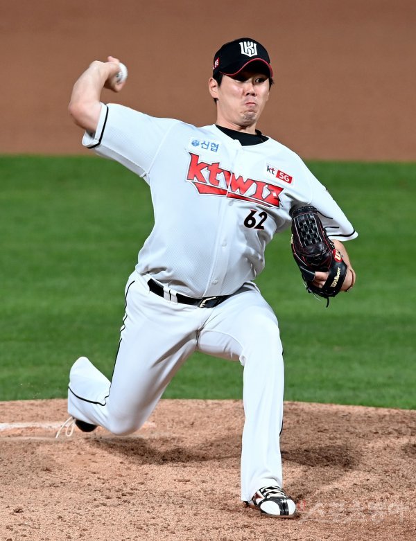 9회초 무사에서 kt 마무리 김재윤이 구원 등판해 볼을 던지고 있다.