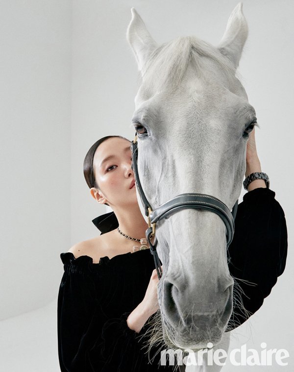 또 다른 컷에서는 <더 킹: 영원의 군주>의 주역으로 활약한 백마, 벤자민과 함께 촬영을 진행하였다. 김고은은 벤자민의 얼굴을 기대거나 등에 눕는 것처럼 과감한 포즈를 선보이며 인상적인 장면을 연출했다. 그 결과 블랙 벨벳 드레스, 화이트 트위트 재킷과 스커트 룩처럼 브랜드의 정수가 담긴 룩에 승마 특유의 품위있는 분위기가 더해져 눈길을 끌었다.