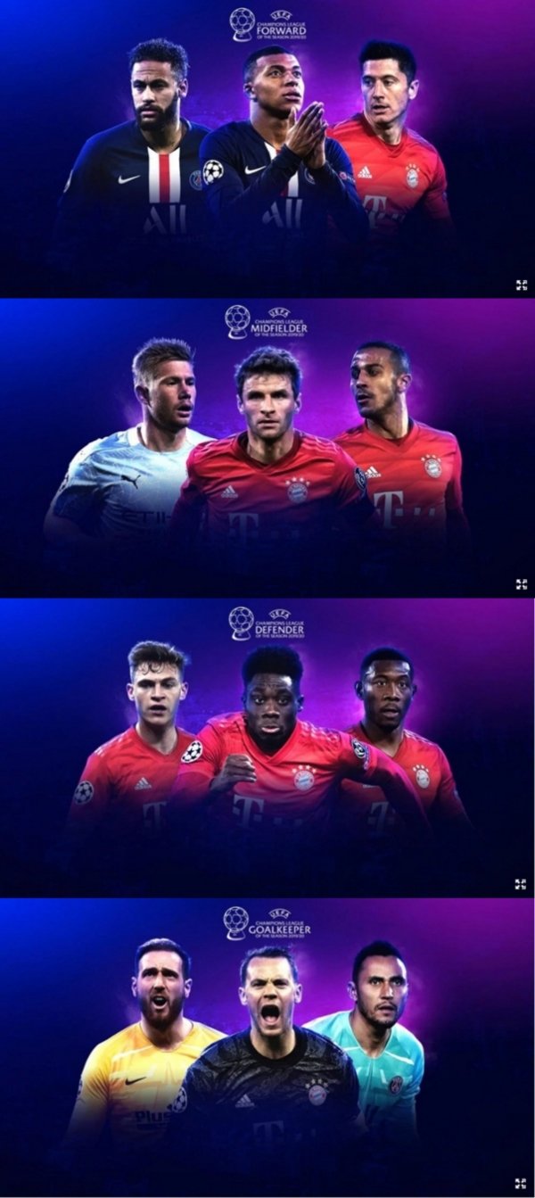 유럽축구연맹(UEFA)이 2019-20 UEFA 챔피언스리그 포지션별 최고 선수 최종 후보를 발표했다.