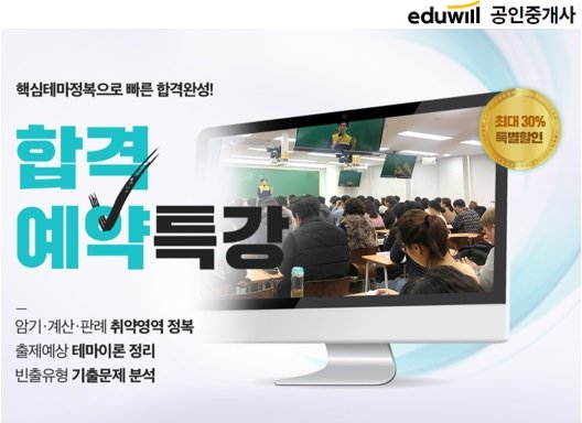 공인중개사 ‘합격예약특강’은 계산문제, 유사 법률 조항 등 틀리기 쉬운 유형을 학습하고 민법 판례, 등기법 등 중요도가 높은 이론을 집중적으로 정리한다. 이어 빈출 문제유형을 파악해 이해 및 응용 능력을 향상시킬 수 있다.