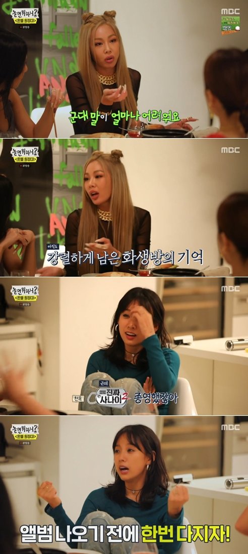 그는 화생방 훈련을 회상하며 “난리가 났다. 정화통을 머리 위로 들어야 하는데 올려놨다. 너무 멘붕이 와서 죽을 것이라는 느낌이 들었다. 언니도 가봐라”고 말했다.