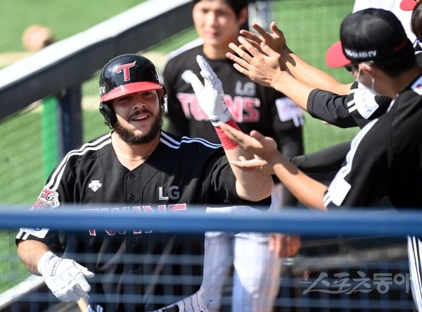 20일 서울 잠실야구장에서 ‘2020 신한은행 SOL KBO 리그’ LG 트윈스와 두산 베어스 경기가 열렸다. 1회초 1사 1루 LG 라모스가 중월 투런 홈런을 날리고 그라운드를 돌아 홈인해 하이파이브 하고 있다.