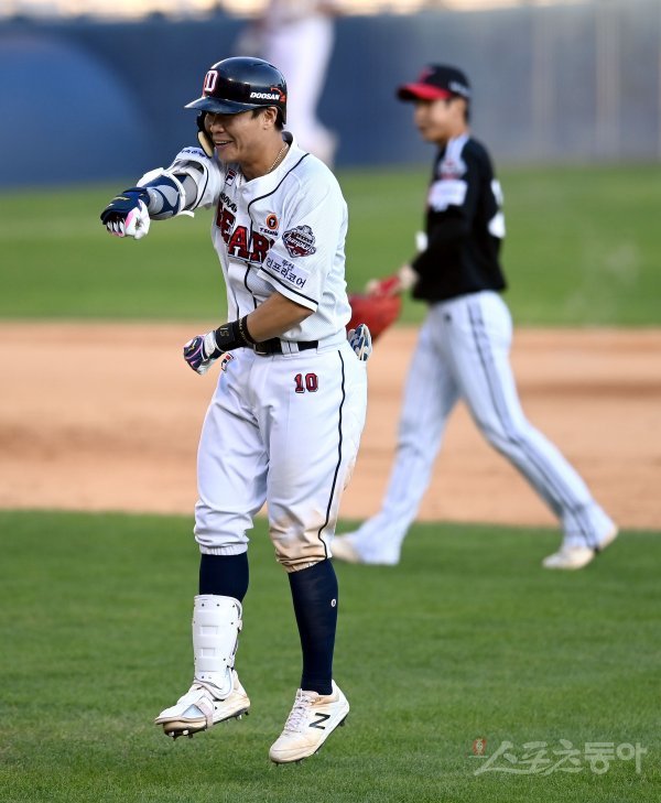 9회말 2사 2루 두산 박세혁이 끝내기 안타를 친 후 기뻐하고 있다.