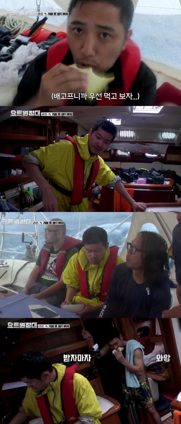 이러한 장기하의 샌드위치를 받은 대원들은 멀미를 이겨 내기 위해 폭풍 먹방을 펼쳤다고. 몰아치는 강풍 속 샌드위치를 와구와구 먹는 진구, 최시원, 송호준의 모습이 그 어디서도 보지 못한 광경을 연출한다. 기울어진 요트의 모습은 아슬아슬 긴장감을 자아내며, 극한의 먹방을 예고하고 있다.