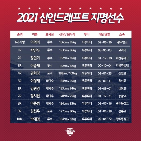 KIA타이거즈는 5라운드 이영재(유신고. 외야수), 6라운드 김원경(비봉고. 내야수), 7라운드 장시현(충암고. 내야수), 8라운드 이준범(동성고. 내야수), 9라운드 김선우(강릉고. 포수), 10라운드 박대명(동성고. 투수) 등 총 10명을 지명했다.