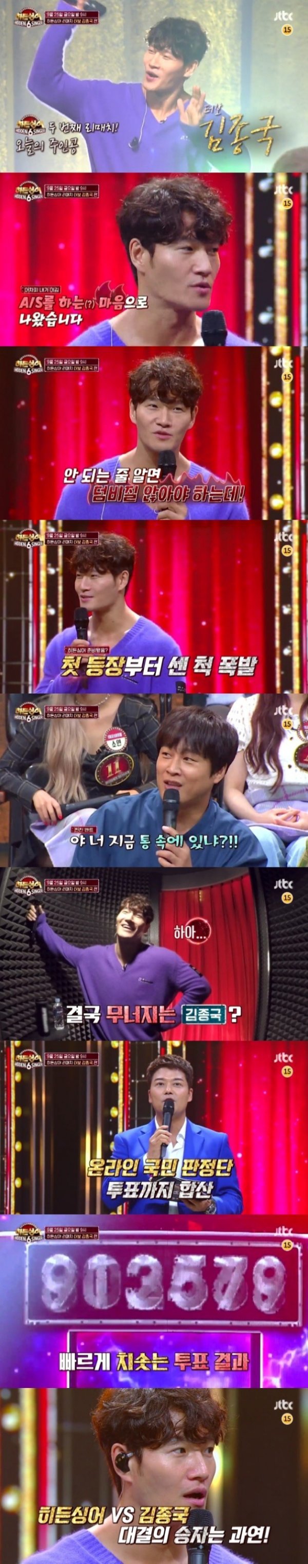 ‘히든싱어6’의 두 번째 리매치 주인공 김종국이 등장하자마자 센 척했지만, 첫 언택트 녹화에 참여한 온라인 국민 판정단의 선택은 모두를 경악하게 했다.