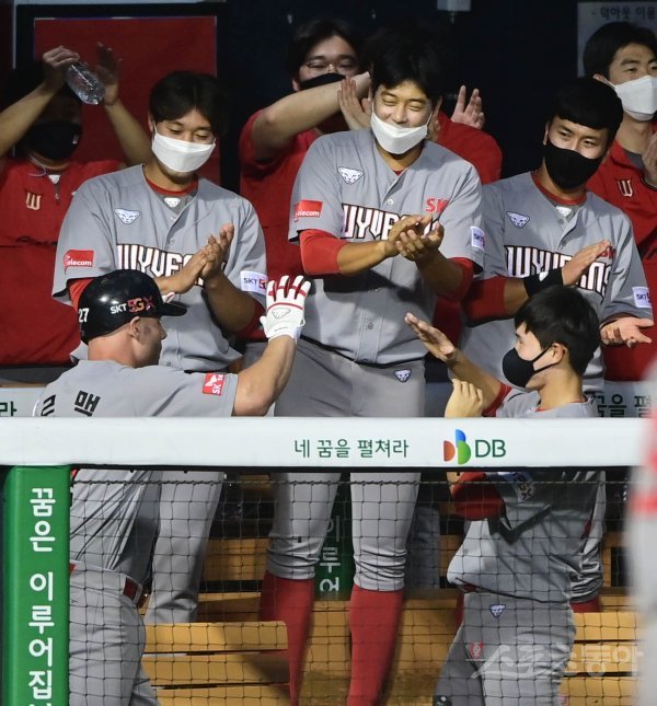 2회초 무사 SK 로맥이 선제 좌월 솔로 홈런을 쳐낸 뒤 더그아웃에서 동료들의 축하를 받고 있다.