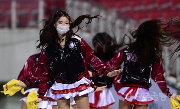 LG 치어리더들이 응원 단상에서 공연을 펼치고 있다.