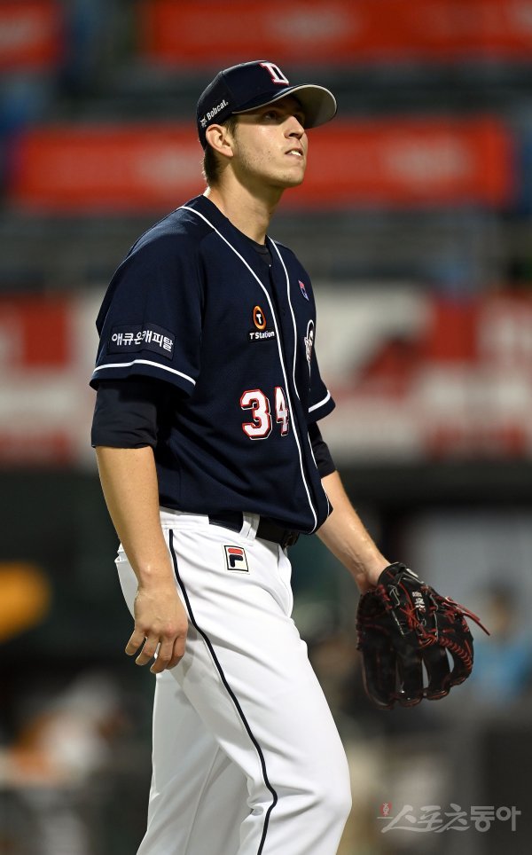 선발 투수로 등판한 두산 플렉센이 4회말 4실점 한 후 더그아웃으로 들어가고 있다.