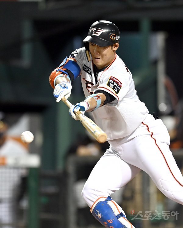 4회말 1사 한화 하주석이 기습번트로 안타를 만들고 있다.