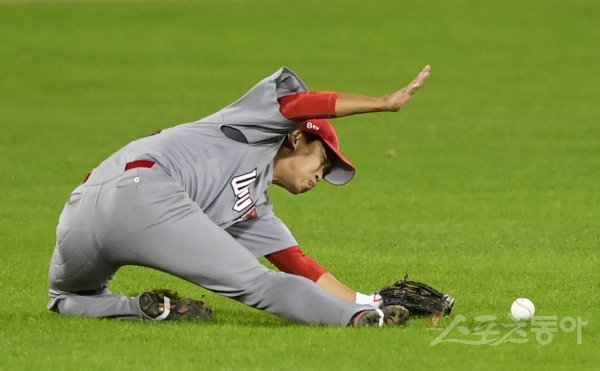 SK 좌익수 고종욱이 6회말 무사 1, 2루 LG 라모스의 타구를 쫓았지만 슬라이딩에 실패하며 공을 놓치고 있다.