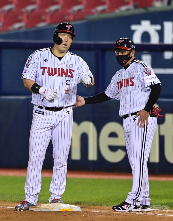 LG 김현수가 6회말 무사 만루 밀어내기 볼넷으로 1루로 걸어나간 뒤 김호 1루코치의 축하를 받고 있다.
