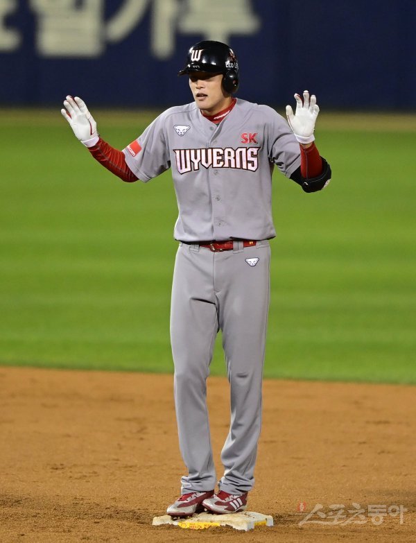 5회초 무사 SK 채현우가 좌전 2루타를 쳐낸 뒤 심판에게 타임을 신청하고 있다.