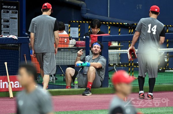 경기 전 SK 화이트가 부상으로 왼손에 보호대를 착용하고 동료들과 이야기를 나누고 있다.