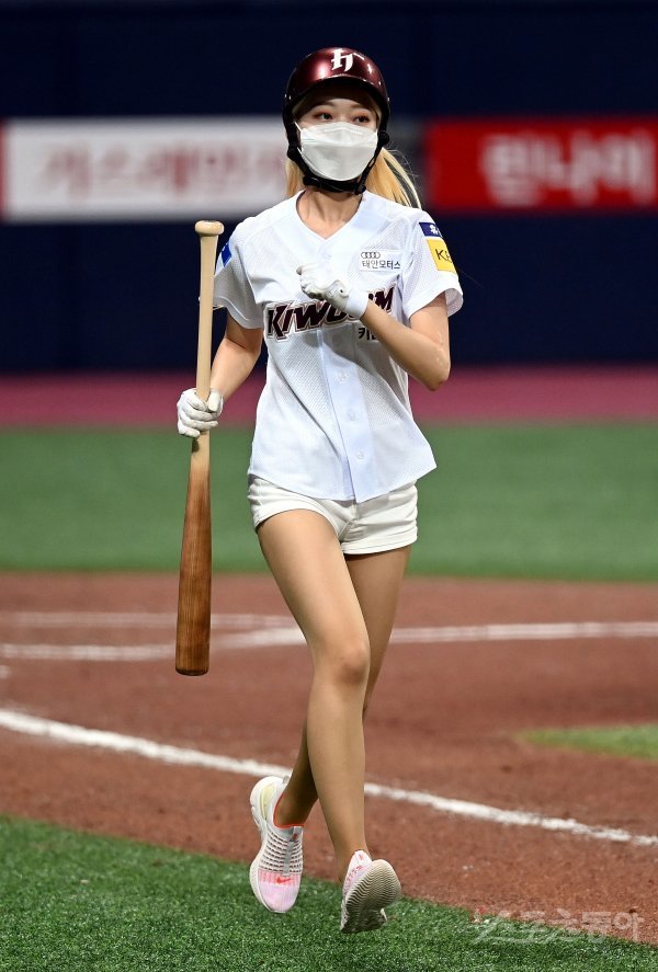 키움 배트걸이 배트를 들고 그라운드를 달리고 있다.