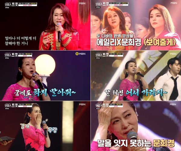 25일 방송된 ‘보이스트롯’ 12회에서는 장장 6개월간의 대장정을 마무리하는 대망의 결승 듀엣 미션과 개인 미션 무대가 펼쳐졌다. 문희경은 듀엣 미션에서 에일리와 ‘보여줄게’ 무대를 선보였다. 듀엣 파트너로 가수 에일리를 선정한 이유에 대해 “꿈에 그리고 좋아했던 분이다. 디바가 되는 것이 꿈이었다. 포기했던 꿈을 이루기 위해 에일리에게 직접 연락했다”라고 밝혀 무대를 더욱 기대하게 했다.