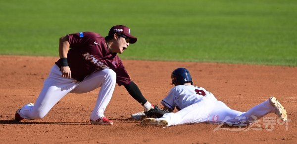 27일 서울 잠실야구장에서 ‘2020 신한은행 SOL KBO리그’ 두산 베어스와 키움 히어로즈의 더블헤더 1차전 경기가 열렸다. 5회말 1사 1루 두산 김인태의 타석 때 키움 유격수 김하성이 1루주자 조수행에게 도루를 허용하고 있다. 잠실 | 주현희 기자 teth1147@donga.com