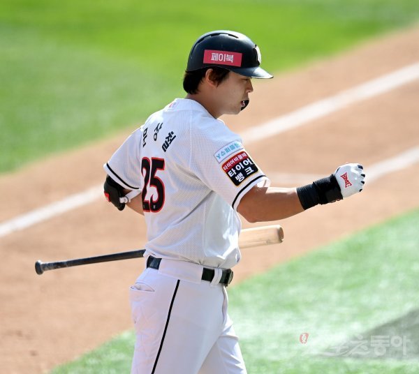 27일 수원 KT위즈파크에서 ‘2020 신한은행 SOL KBO 리그’ LG 트윈스와 KT 위즈 경기가 열렸다. 2회말 1사 KT 문상철이 좌중월 솔로 홈런을 날리고 그라운드를 돌아 홈인해 하이파이브 하고 있다. 수원 | 김종원 기자 won@donga.com