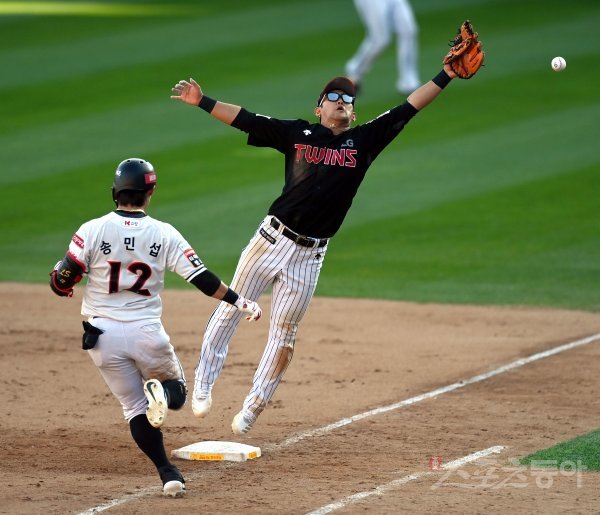 9회말 무사 2루 KT 보내기번트 때 LG 정주현이 악송구된 볼을 놓치고 있다.