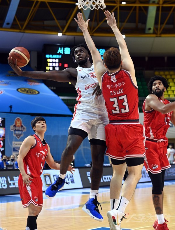 27일 전라북도 군산 월명체육관에서 열린 ‘2020 MG새마을금고 KBL CUP’ 서울 SK와 고양 오리온의 결승 경기에서 SK 워니가 오리온 이승현의 수비를 앞에 두고 슛을 쏘고 있다.