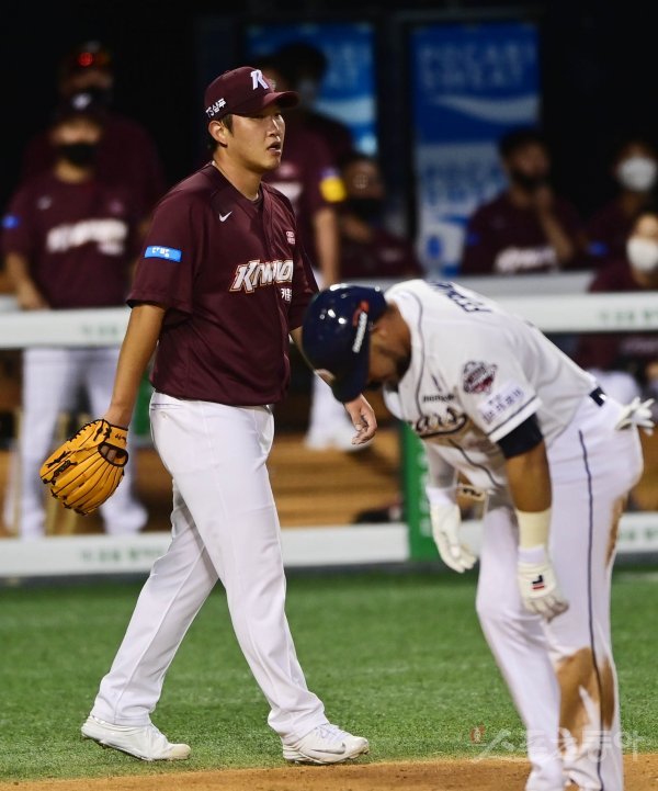 3회말 1사 1, 2루 두산 1타점 2루타 때 키움 윤정현이 아쉬워하고 있다.