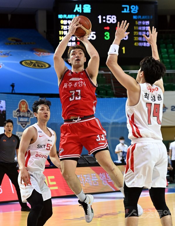 27일 전라북도 군산 월명체육관에서 열린 ‘2020 MG새마을금고 KBL CUP’ 서울 SK와 고양 오리온의 결승 경기에서 오리온 이승현이 SK 최성원의 수비를 앞에 두고 슛을 쏘고 있다. 군산 | 김민성 기자 marineboy@donga.com